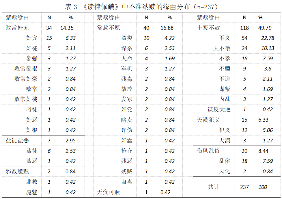 表3為禁贖條款中禁贖緣由的分布情況。所有緣由中排名前三的分別是十惡不赦、常赦不原和敗常奸宄,其次是以具體行為作為理由的天潢犯義、傷風亂俗、鹽徒鹽惡和邪教魘魅,最后才是與資產(chǎn)相關(guān)的無資可贖。十惡不赦和常赦不原皆為清律名例律中法定罪名,而其他禁贖緣由則是王明德在詳查律意的基礎(chǔ)上“揣擬”給出。關(guān)于禁贖緣由,主要發(fā)現(xiàn)如下: