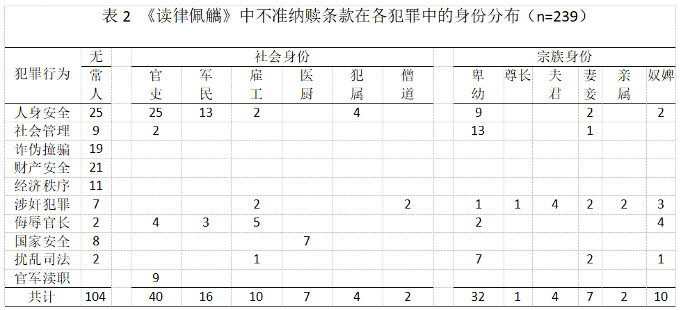 社會身份中,數(shù)量僅次于官吏類主體的身份為軍民(軍民、軍士、部民)。該類主體所涉犯罪屬于真正身份犯。軍民類身份的禁贖條款主要分布在針對本管長官的犯罪中,罪行主要為辱罵、毆打和謀殺。這些犯罪與前述“屏去人服食”罪相同,不論結(jié)果輕重,一律不得用贖。其他社會主體中,雇工類身份的禁贖條款分布廣,罪行基本都是針官長的犯罪。以分布最多的辱罵官長(n=5)為例,按照《讀律》要求,雇工人凡罵家長及其近親屬(期親、大功親、小功親、緦麻親)的,皆不得用贖。犯屬類主體的禁贖條款則出自刑律中的“殺一家非死罪三人”“采生折割人”和“造畜蠱毒堪以殺人”三項罪名。清律規(guī)定,犯此三類罪名的,除本犯處死不得用贖外,不知情的犯人家屬連坐處以流刑。僧道類身份的禁贖條款較少,集中分布于“居喪及僧道犯奸”罪中。醫(yī)廚類身份集中分布于國家安全類犯罪中,是因為其罪行為“儀制”中的“合和御藥”罪。