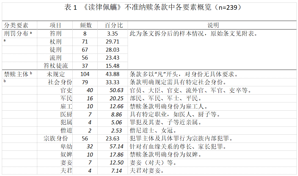 本研究團隊選擇由何勤華、程維榮等人點校,法律出版社2001年出版的《讀律佩觿》為研究素材,共載禁贖條款201條。需要說明的是,這些禁贖條款雖然經(jīng)過王明德的初步拆分,但受當時技術(shù)限制,仍有些許疏漏之處。一是,部分適用于死刑減等人犯的條款,不涉及具體犯罪;二是,一些條款后的禁贖緣由并不具體,而是只用“律不準贖”予以標示;三是,部分條款的信息并不全面,細節(jié)缺損較多;四是,條款拆分不夠完善,王明德遵循“一事一語”方式,只以卷目中的犯罪行為為中心,將禁贖條款按刑罰分等拆分(詳見附表)。