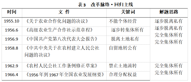 在社會(huì)主義改造完成之后(1956—1978),中國(guó)共產(chǎn)黨再次采取了“進(jìn)”的策略,自上而下地推進(jìn)農(nóng)村土地集體所有的產(chǎn)權(quán)政策。根據(jù)本文第二部分的黨史資料顯示,在此22年間的4份農(nóng)村土地產(chǎn)權(quán)政策中,頻繁出現(xiàn)的有“把社員私有的主要生產(chǎn)資料轉(zhuǎn)為合作社集體所有”“各盡所能,按勞取酬”“自留地可能在并社中變?yōu)榧w經(jīng)營(yíng)”“自留地、自留山、宅基地等等,一律不準(zhǔn)出租和買(mǎi)賣(mài)”等表述,這些詞句體現(xiàn)了中國(guó)共產(chǎn)黨推進(jìn)“二進(jìn)”策略的內(nèi)容。