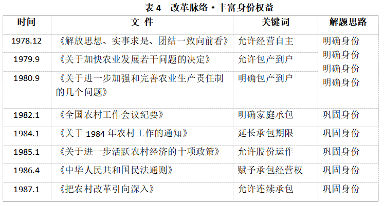 1978年冬至1980年秋,中國(guó)共產(chǎn)黨通過(guò)4份文件逐步明確了農(nóng)村土地使用權(quán)的基礎(chǔ)政策。在黨的十一屆三中全會(huì)提出要賦予農(nóng)民“經(jīng)營(yíng)自主權(quán)”后,從《關(guān)于加快農(nóng)業(yè)發(fā)展若干問(wèn)題的決定(草案)》中的“不許包產(chǎn)到戶(hù)”,到十一屆四中全會(huì)上的允許“包產(chǎn)到戶(hù)”,再到《關(guān)于進(jìn)一步加強(qiáng)和完善農(nóng)業(yè)生產(chǎn)責(zé)任制的幾個(gè)問(wèn)題》中的明確采取“包產(chǎn)到戶(hù)”,可以感受到經(jīng)過(guò)慎重考量后,黨通過(guò)“包產(chǎn)到戶(hù)”的產(chǎn)權(quán)政策明確了農(nóng)民的身份權(quán)益。