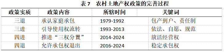 進(jìn)階的“進(jìn)”與“退”發(fā)生于1978年至2024年期間,對(duì)應(yīng)著中國(guó)共產(chǎn)黨對(duì)于升級(jí)命題的解題:通過(guò)理性的“進(jìn)”與“退”,以及帶有探索色彩的權(quán)能分離解決了農(nóng)村土地產(chǎn)權(quán)的權(quán)能配置問(wèn)題,起到了指明農(nóng)村土地產(chǎn)權(quán)政策的改革方向,凸顯時(shí)代性與現(xiàn)代性的作用。