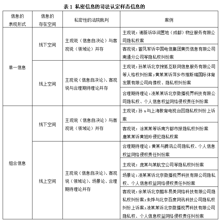 從表1所列的四種司法樣態(tài)可以看出,在線下非網(wǎng)絡(luò)空間中,單一信息與組合信息的認(rèn)定標(biāo)準(zhǔn)是一致的,既需要滿足主觀說(shuō),也需要滿足客觀說(shuō)。有學(xué)者將“主觀說(shuō)+客觀說(shuō)”這一并存的判斷模式,解釋為司法裁判的適用設(shè)置了私密性檢驗(yàn)義務(wù)。