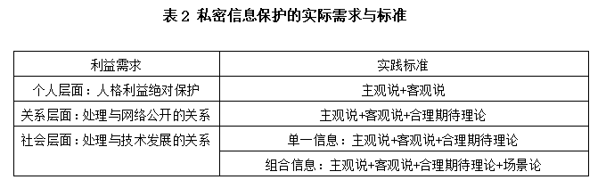 總之,我國(guó)實(shí)踐中的認(rèn)定標(biāo)準(zhǔn),既強(qiáng)調(diào)了個(gè)人層面的保護(hù),也關(guān)注到關(guān)系層面和社會(huì)層面的保護(hù)。不同認(rèn)定標(biāo)準(zhǔn)的出現(xiàn)乃為了回應(yīng)互聯(lián)網(wǎng)、人工智能等技術(shù)發(fā)展對(duì)私密信息利益保護(hù)的新需求,乃努力填充人際關(guān)系交往層面和社會(huì)層面的利益保護(hù)(見(jiàn)表2)。具體來(lái)看,一是,從個(gè)人角度來(lái)看,如果某信息并未進(jìn)入信息流動(dòng)的場(chǎng)景之中,還只處于自己控制的范圍之內(nèi),此時(shí),受保護(hù)的利益需求只來(lái)自于個(gè)人。那么無(wú)論是線上還是線下,采主觀說(shuō)與客觀說(shuō)并存的標(biāo)準(zhǔn),可以完成對(duì)個(gè)人人格利益的絕對(duì)保護(hù)。二是,從關(guān)系層面來(lái)看,如果某信息已經(jīng)進(jìn)入到信息流動(dòng)的“部分人”場(chǎng)景之中,在線下空間該部分人可以較為清楚地知悉該信息是否保有秘密狀態(tài)。此時(shí),該信息是否可繼續(xù)流動(dòng),以權(quán)利人的意愿為主并無(wú)不妥,采主觀說(shuō)與客觀說(shuō)并存的標(biāo)準(zhǔn),可以完成對(duì)個(gè)人人格利益和他人言論自由的平衡保護(hù)。在線上空間,該部分人則未必清楚地知悉該信息是否保有秘密狀態(tài)。此時(shí),該信息是否可繼續(xù)流動(dòng),完全以權(quán)利人的意愿為主,難以完成對(duì)個(gè)人人格利益和他人言論自由的平衡保護(hù)。在主觀說(shuō)與客觀說(shuō)并存的基礎(chǔ)上,仍需判斷合理期待理論,意在限縮權(quán)利人控制的私密信息范圍。三是,從社會(huì)層面來(lái)看,如果某信息已經(jīng)進(jìn)入到信息流動(dòng)的社會(huì)場(chǎng)景之中,信息則具有促進(jìn)技術(shù)發(fā)展應(yīng)用的社會(huì)需求。此時(shí)私密信息的保護(hù)范圍不僅需受合理期待理論的限制,還要考慮與信息平臺(tái)等技術(shù)主體之間的利益平衡,根據(jù)實(shí)際情況適用場(chǎng)景論。