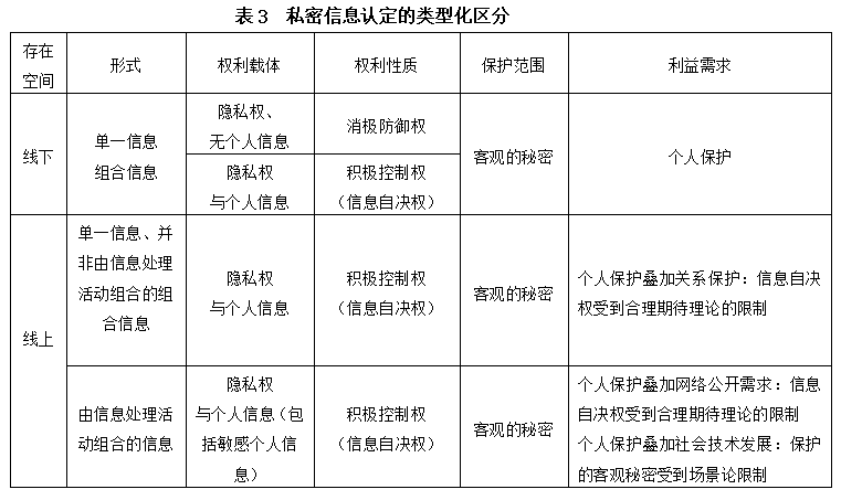 按照表3的區(qū)分方式,可以將私密信息的認(rèn)定情形總結(jié)為四種類型,無(wú)論哪種類型,受保護(hù)的都是一種秘密,即需滿足客觀說(shuō)的標(biāo)準(zhǔn):