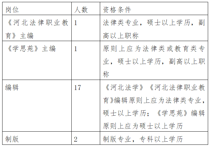 專業(yè)技術(shù)崗位、制版崗位的續(xù)聘、崗位交流。在期刊社崗位設(shè)置范圍內(nèi)組織實施,專業(yè)技術(shù)崗位的續(xù)聘應(yīng)符合《河北政法職業(yè)學(xué)院崗位聘用管理暫行辦法》的基本條件和聘用條件(期刊社崗位及資格條件見附件1)。有意崗位交流到期刊社的,應(yīng)符合期刊社崗位及資格條件。請符合條件且有意交流到期刊社的同志于2025年2月10日上午12時前填寫《崗位申請表》(附件2)。聯(lián)系人:崔佳麗,電話:13931896239。崗位人數(shù)超過1人時,組織競聘演講,時間不超過5分鐘。于2月10日下午15:00組織競聘。地點:期刊社。根據(jù)競聘演講情況由期刊社崗位聘用小組會議研究確定人選。