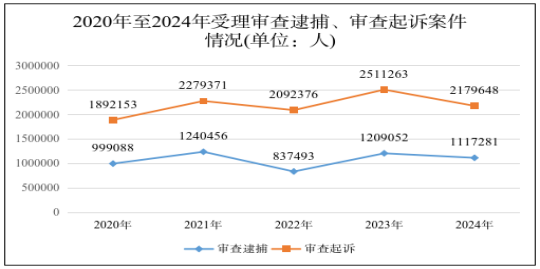 1. 刑事案件受理數(shù)量有所下降。2024年,全國檢察機(jī)關(guān)共受理審查逮捕各類犯罪781919件1117281人,同比分別下降5.7%、7.6%;審查后共批準(zhǔn)和決定逮捕752594人,同比上升3.6%。受理審查起訴各類犯罪1531209件2179648人,同比分別下降14.3%、13.2%;審查后決定起訴1630685人,同比下降3.4%。