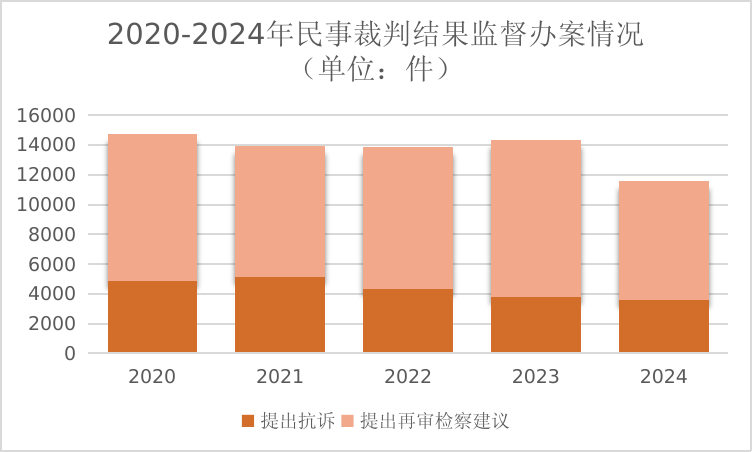 受理民事執(zhí)行活動(dòng)監(jiān)督案件61464件,2020年至2023年受理數(shù)分別為49390件、65842件、84125件、77310件,連續(xù)三年上升后2023年開始下降,2024年降幅較大(下降12.7%)。提出檢察建議51766件,法院采納率97.8%。