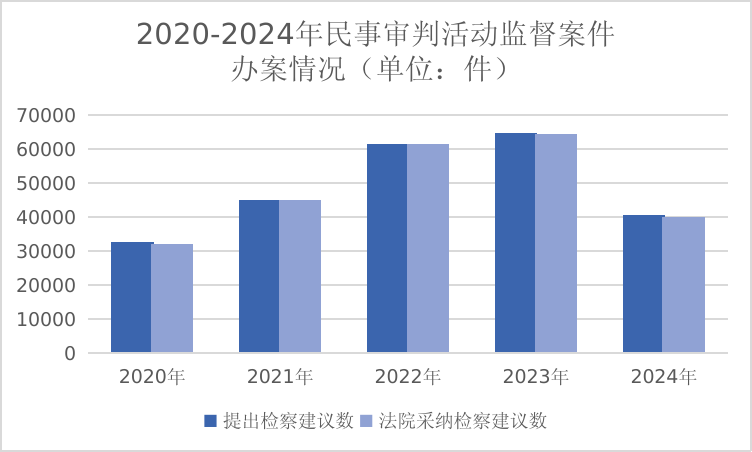 2024年,全國檢察機(jī)關(guān)共受理民事審判活動(dòng)監(jiān)督案件47034件,2020年至2023年受理數(shù)分別為37220件、52141件、69463件、69376件,在連續(xù)三年大幅上升后今年首次下降。提出檢察建議40631件,法院采納率98.6%。