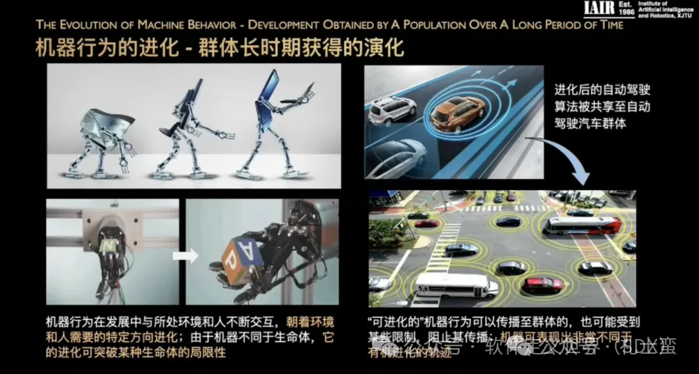 同時由于機器不同于生命體,它的進化可以突破某種生命體的局限性,而且可進化的機器行為可以傳播至群體廣泛的機器行為存在,也可能受到某些限制,阻止其傳播,機器可表現(xiàn)出非常不同于有機進化的軌跡。比如進化后的無人駕駛算法,可以共享至無人駕駛汽車群體,實現(xiàn)行為能力的傳播。