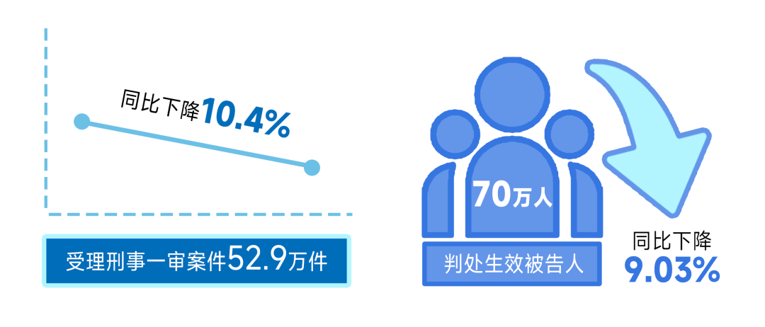 刑事案件審判情況。人民法院全面貫徹總體國家安全觀,準(zhǔn)確貫徹寬嚴(yán)相濟(jì)刑事政策,依法懲治各類犯罪,以嚴(yán)格公正司法維護(hù)國家安全和社會穩(wěn)定。受理刑事一審案件52.9萬件,同比下降10.4%。判處生效被告人70萬人,同比下降9.03%。依法嚴(yán)懲嚴(yán)重刑事犯罪,判處五年有期徒刑以上刑罰的罪犯5.1萬人,同比下降4.65%。受理破壞社會主義市場經(jīng)濟(jì)秩序罪一審案件3.5萬件,同比上升2.65%。最高人民法院發(fā)布5件促進(jìn)民營經(jīng)濟(jì)發(fā)展典型刑事案例,加強(qiáng)對非法經(jīng)營、合同詐騙、強(qiáng)迫交易、民營企業(yè)內(nèi)部腐敗犯罪等案件的監(jiān)督指導(dǎo),依法平等保護(hù)民營企業(yè)合法權(quán)益。受理串通投標(biāo)罪一審案件707件,同比上升30.44%。針對串通投標(biāo)犯罪大幅上升態(tài)勢,最高人民法院聯(lián)合國家發(fā)展和改革委員會發(fā)布6件典型案例,涵蓋工程建設(shè)、物資采購、土地承包等多個經(jīng)濟(jì)領(lǐng)域,發(fā)揮典型案例教育警示震懾作用。受理危險駕駛罪一審案件12.1萬件,同比下降14.96%。危險駕駛刑事案件數(shù)量降幅明顯,但仍居刑事案件第一位。人民法院深入貫徹落實(shí)《關(guān)于辦理醉酒危險駕駛刑事案件的意見》,規(guī)范案件辦理,統(tǒng)一裁判尺度,實(shí)現(xiàn)對醉駕犯罪的精準(zhǔn)打擊、懲防并重。