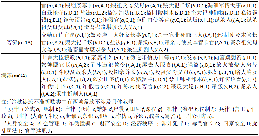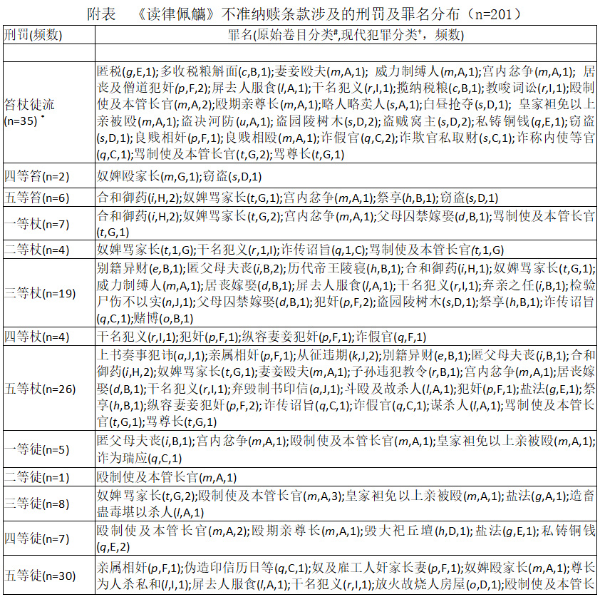 本研究團隊選擇由何勤華、程維榮等人點校,法律出版社2001年出版的《讀律佩觿》為研究素材,共載禁贖條款201條。需要說明的是,這些禁贖條款雖然經(jīng)過王明德的初步拆分,但受當時技術(shù)限制,仍有些許疏漏之處。一是,部分適用于死刑減等人犯的條款,不涉及具體犯罪;二是,一些條款后的禁贖緣由并不具體,而是只用“律不準贖”予以標示;三是,部分條款的信息并不全面,細節(jié)缺損較多;四是,條款拆分不夠完善,王明德遵循“一事一語”方式,只以卷目中的犯罪行為為中心,將禁贖條款按刑罰分等拆分(詳見附表)。
