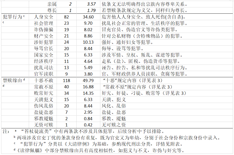 考慮到禁贖條款分布較廣,且內(nèi)容規(guī)定涉及罪、人、罰等復雜情事。研究團隊在轉(zhuǎn)錄過程中,根據(jù)主題和研究需要,對拆分后的條款從以下三個方面進行了信息整合(詳見表1)。一是禁贖主體,根據(jù)法條規(guī)定和先前的爭議焦點,將禁贖主體分為無身份要求、社會身份和宗族身份三類。二是犯罪行為,禁贖條款相關(guān)罪行涉及74項罪名,難以逐一羅列。因此,研究團隊參考先前的研究,按照現(xiàn)代刑法的分類標準對各類犯罪行為重新歸納。三是禁贖緣由,雖然多數(shù)禁贖條款后標示了相應緣由,但諸多緣由較為細碎雜亂,且部分緣由標注不清。研究團隊將原始緣由結(jié)合律意進行整合后,共得出十惡不赦、常赦不原、敗常奸宄、天潢犯義等八種禁贖緣由。