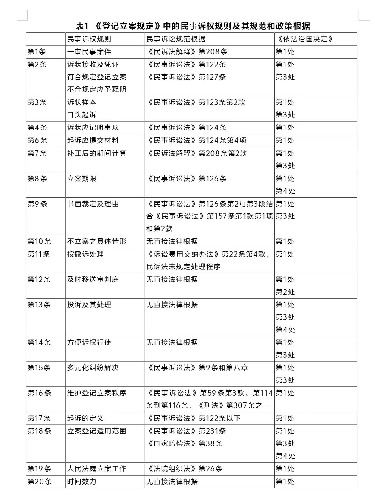 囿于篇幅,避免贅文,《登記立案規(guī)定》中民事訴權(quán)規(guī)則及其規(guī)范和政策根據(jù)列表如下(見表1):