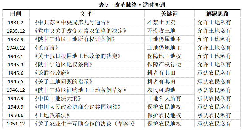 “研究歷史,應(yīng)該從現(xiàn)時(shí)代中找問(wèn)題,應(yīng)該在過(guò)去時(shí)代中找答案”。在回答基礎(chǔ)命題時(shí),中國(guó)共產(chǎn)黨根據(jù)革命形勢(shì),采取了“政府所有—個(gè)人所有—集體所有”的改革思路:通過(guò)沒(méi)收一切生產(chǎn)資料完成了所有權(quán)歸國(guó)家所有的正當(dāng)性證明;通過(guò)允許土地私有獲得了政治認(rèn)同和群眾基礎(chǔ);通過(guò)共同勞動(dòng)與集體經(jīng)營(yíng)完成了所有權(quán)應(yīng)歸集體所有的正當(dāng)性證明。在回答升級(jí)命題時(shí),中國(guó)共產(chǎn)黨采取了“從身份到契約”的改革思路:通過(guò)落實(shí)承包權(quán)、延長(zhǎng)承包期明確鞏固了農(nóng)民作為土地使用權(quán)人的身份;通過(guò)對(duì)使用權(quán)的權(quán)能分離豐富了農(nóng)民的各項(xiàng)權(quán)利。