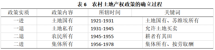 最初的“兩進(jìn)兩退”發(fā)生于1921年至1978年期間,對(duì)應(yīng)著中國(guó)共產(chǎn)黨對(duì)于基礎(chǔ)命題的解題:通過(guò)適時(shí)的進(jìn)與退,以及帶有試驗(yàn)色彩的權(quán)能分離,中國(guó)共產(chǎn)黨解決了農(nóng)村土地所有權(quán)的歸屬問(wèn)題,起到了為農(nóng)村土地產(chǎn)權(quán)政策體系定基調(diào)的作用。