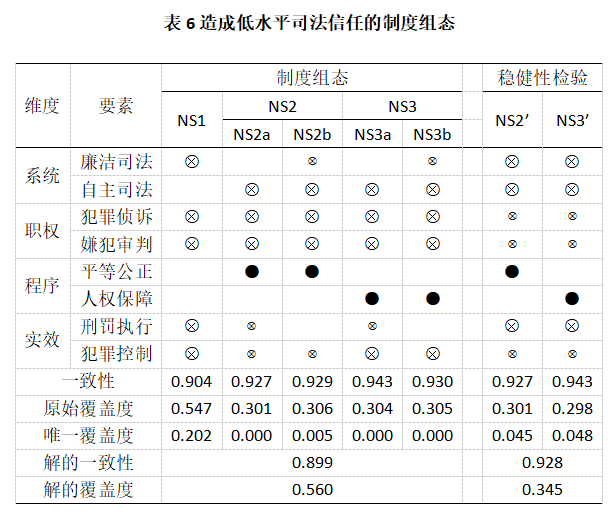 本研究繼續(xù)使用fsQCA 4.1軟件分析產(chǎn)生低水平司法信任的制度組態(tài)。在此部分中,對應(yīng)地將結(jié)果變量修改為低水平司法信任,在反事實分析設(shè)定中每個條件變量的缺失(Absent)均會作用于低水平司法信任,除此之外其余操作步驟與前文相同。分析結(jié)果如表6所示,可以歸納出導(dǎo)致低水平司法信任的三種制度組態(tài)。組態(tài)NS1顯示,當(dāng)刑事訴訟制度的系統(tǒng)、職權(quán)、實效均表現(xiàn)不佳時,民眾難以信任其所處社會的司法。組態(tài)NS2和NS3涵蓋了兩條子路徑,每條路徑中系統(tǒng)、職權(quán)、實效維度同樣缺失,但平等公正或人權(quán)保障會作為核心條件存在。這說明了正當(dāng)程序之于司法信任獨木難支,在其余制度側(cè)面未得到充分建設(shè)之前,即使刑事訴訟制度具備平等公正或人權(quán)保障的程序理念,民眾也難以認可該制度。此外,本文也對產(chǎn)生低水平司法信任的制度組態(tài)進行了相同步驟的穩(wěn)健性檢驗,得到的條件組態(tài)NS2’和NS3’同樣證明,忽視制度的其余方面,僅在程序維度注重法律面前人人平等或是追求控辯平等對抗,無法形成令社會普遍信服的刑事訴訟制度。