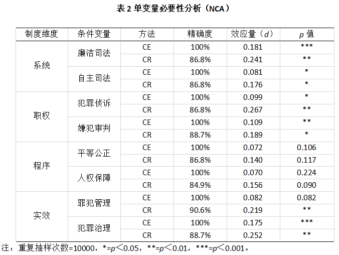 在進行充分性的組態(tài)分析之前,需要檢驗各個條件變量的必要性,從而揭示制度組態(tài)中可能存在的條件必要性限制。如前所述,本研究在基于R語言的NCA程序包中,采用校準(zhǔn)后的模糊集進行必要條件分析。NCA提供了CE(Ceiling Envelopment)和CR(Ceiling Regression)兩種方法,由于CE方法的精確度為100%,所以本研究以CE方法為主進行分析,同時以CR方法檢驗穩(wěn)健性,分析結(jié)果如表2所示。