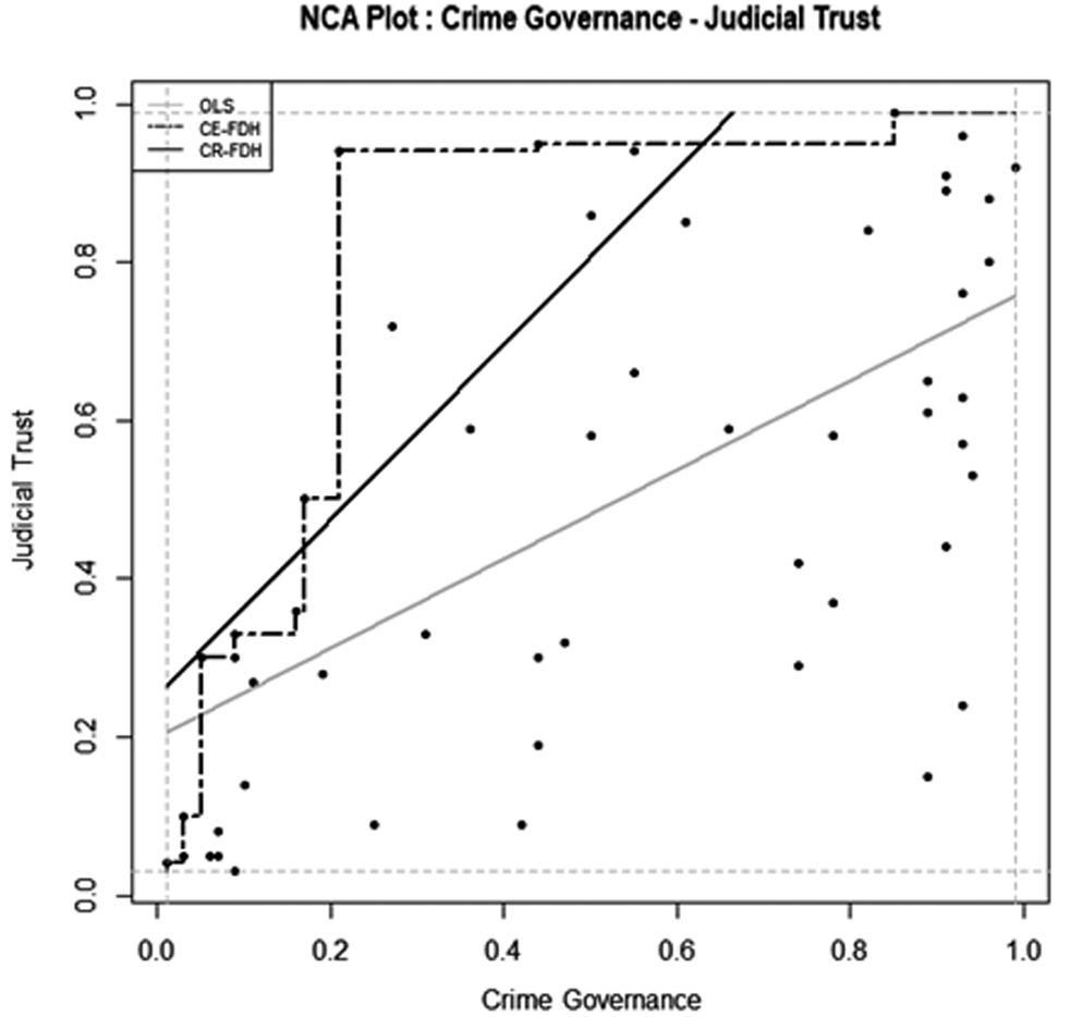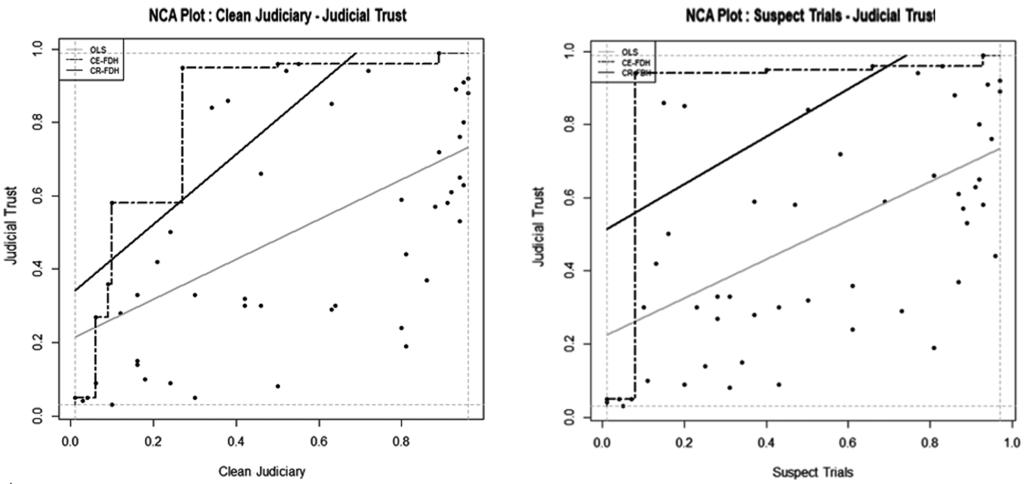 NCA通過分析前因條件的必要性效應(yīng)量(d)及其顯著性來識別必要條件,根據(jù)NCA開發(fā)者杜爾的研究,當(dāng)某個條件的效應(yīng)量大于0.1,且蒙特卡洛仿真置換檢驗(Monte Carlo Simulations of Permutation Tests)得出的p值小于0.05時,就可以判定該條件為產(chǎn)生結(jié)果變量的必要條件。表2顯示,廉潔司法(d=0.181,p<0.001)、嫌犯審判(d=0.109,p<0.01)、犯罪治理(d=0.175,p<0.001)在兩種方法中均滿足要求,因此可以視為一個國家產(chǎn)生高水平司法信任的必要條件。為了更好地呈現(xiàn)此三個條件變量對高水平司法信任的必要性限制,繪制散點情況如圖2、圖3、圖4所示。