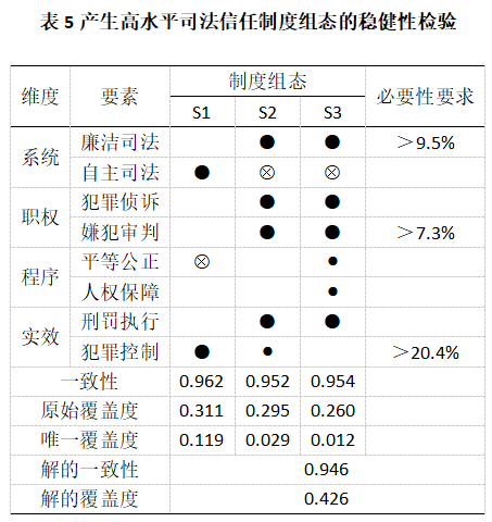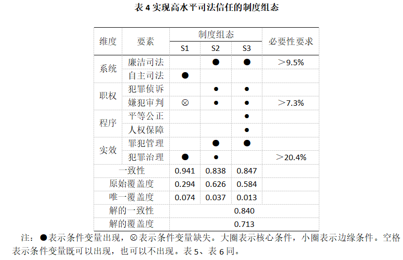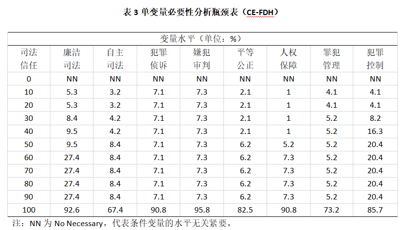如表3所示,欲達到高水平司法信任(變量水平>50%),廉潔司法水平至少要達到9.5%,即超過9.5%的樣本國家。反之,在低水平司法信任的國家,廉潔司法水平不會高于9.5%。同理,欲達到高水平司法信任,嫌犯審判水平至少要達到7.3%,犯罪治理水平至少要達到20.4%。申言之,如果此三個條件變量沒有達到特定的水平,無論一個國家的刑事訴訟制度的其余要素多么完善,民眾也難以信任該國的司法。因此,對待必要條件的最佳策略是優(yōu)先發(fā)展廉潔司法、嫌犯審判、犯罪治理這些先決要素,避免它們位于低水平的尷尬處境,之后再謀求制度各個方面的均衡建設(shè)。此外,體現(xiàn)制度實效的犯罪治理水平最顯著地限制司法信任的產(chǎn)生,這印證了民眾對于治理績效的敏銳感知,一旦犯罪率居高不下,便難以挽回刑事司法的聲望和信譽。