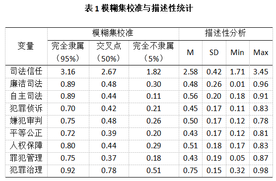 在進行下文的因果必要性與充分性關(guān)系分析之前,需要對各個變量進行校準(zhǔn),將案例中涉及的原始變量轉(zhuǎn)化為集合隸屬度。由于目前缺乏世界性的量化標(biāo)準(zhǔn)以衡量各國的民眾司法信任水平及刑事訴訟制度建設(shè)情況,本研究以各國樣本之間的相對差異進行校準(zhǔn)。如表1所示,本研究將結(jié)果變量與八個條件變量完全隸屬、交叉點和完全不隸屬的三個校準(zhǔn)點分別設(shè)定為95%、50%、5%分位數(shù)。經(jīng)過校準(zhǔn)后,各國民眾司法信任水平在3.16以上的,將被標(biāo)記為“完全隸屬”,即完全屬于高水平司法信任;在1.82以下的,將被標(biāo)記為“完全不隸屬”,即完全不屬于高水平司法信任;1.82則為界分隸屬與不隸屬的分割線。其余八個條件變量的校準(zhǔn)情況以此類推。此外,為了避免集合隸屬度恰好為0.5的組態(tài)歸屬問題,按照研究慣例,本文將所有為0.5的隸屬度加上0.001常數(shù)。