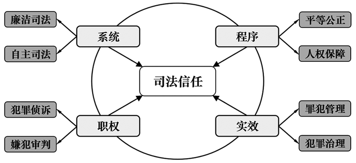 如前所述,基于過程的善治強調(diào)制度績效(Performance)僅是評估制度表現(xiàn)的要素之一,加之正當(dāng)良善的權(quán)力運行才能完整契合公眾對制度的合理期待。具體而言,公共權(quán)力的行使必須滿足公正(Impartiality)、智斷(Good Decision Making)、善行(the Principle of Beneficence)等方面的要求。公正意味著權(quán)力按照既定的法律和規(guī)則運轉(zhuǎn),不僅要求公職人員遠離腐敗,而且要求司法權(quán)力專屬于司法機關(guān),反對司法權(quán)力與行政權(quán)力之間的糾葛。智斷意味著決策的制定和執(zhí)行需要歷經(jīng)理性思考、遵循科學(xué)方法,刑事訴訟場域中私權(quán)利受到強烈干預(yù),司法職權(quán)更應(yīng)當(dāng)謹慎妥當(dāng)?shù)匦惺?。善行意味著?quán)力行使必須遵守公共道德(Public Ethos)、尊重基本人權(quán),在規(guī)則不明晰之時,也應(yīng)當(dāng)采取最有益于權(quán)力對象的行動方案。歷經(jīng)嚴格的規(guī)范框架,國家權(quán)力的行使方能在價值權(quán)衡之間貫徹公共精神,最終產(chǎn)出社會普遍認同的制度績效。據(jù)此,本研究提煉出刑事訴訟制度的四重維度如圖1所示,系統(tǒng)、職權(quán)、程序、實效的四維度劃分囊括了權(quán)力運行的完整過程,每個制度維度均涵蓋兩個核心要素,據(jù)以評價該維度的建設(shè)情況和完善程度。四維度、八元素的理論模型刻畫了刑事訴訟制度運作的生命周期,符合基于制度過程的信任生成邏輯,有利于深入細致地剖析制度的何種側(cè)面更能影響司法信任。