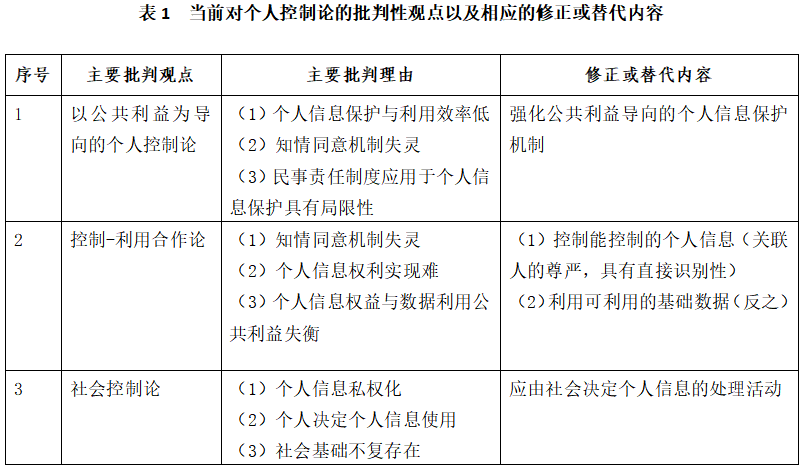 通過表1梳理可以看出:個(gè)人信息保護(hù)模式主要包括兩種:一種模式是主張對(duì)現(xiàn)有的個(gè)人控制理論進(jìn)行修正,如序號(hào)1、序號(hào)2,一種模式是主張用新的控制理論取代之,如序號(hào)3;從對(duì)個(gè)人控制論的批判性理由來看,都認(rèn)識(shí)到了個(gè)人控制論以個(gè)人信息權(quán)為權(quán)利基礎(chǔ),個(gè)人信息私權(quán)化與個(gè)人信息利用產(chǎn)生了沖突;從所提出的修正內(nèi)容或替代理論內(nèi)容上看,都在積極表達(dá)個(gè)人信息的社會(huì)利用屬性。