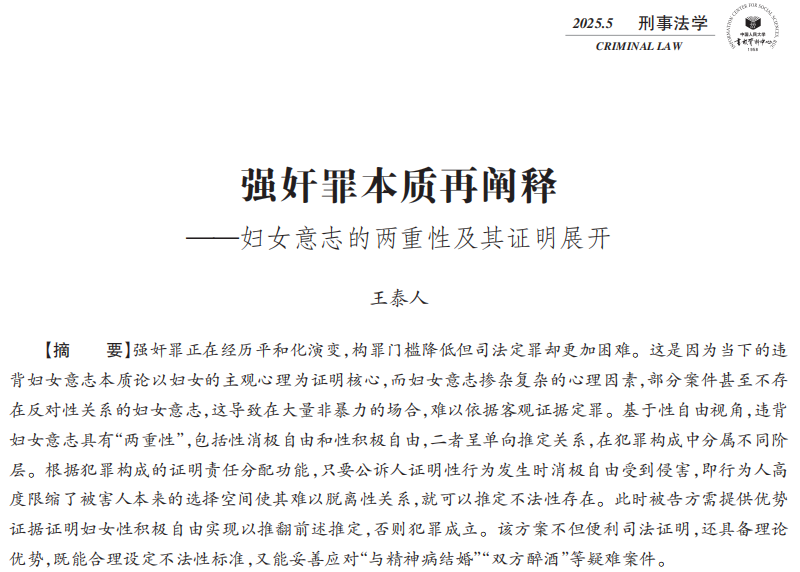 我刊2025年第5期發(fā)表的文章《強(qiáng)奸罪本質(zhì)再闡釋——婦女意志的兩重性及其證明展開》,被中國人民大學(xué)復(fù)印報(bào)刊資料《刑事法學(xué)》2025年第5期全文轉(zhuǎn)載。