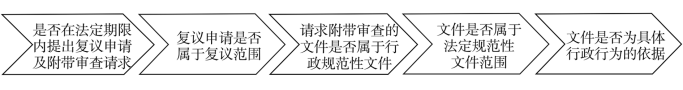 在附帶審查請求進入實體審查程序之前,要經(jīng)過多道關(guān)卡,至少包括圖1所示的五道審查程序,并且各個審查條件是耦合式的,缺一不可。就其適用而言,期限要件、依附要件、對象要件具有獨立價值,不具有命題屬性的期限要件和對象要件不存在適用難題,依附要件除了是相對人受到具體行政行為現(xiàn)實侵害的要素,同時還是行政復議附帶審查區(qū)別于備案審查的要素,因而,在適用時必須存在。依據(jù)要件雖是其核心要素,但其適用存在困難。