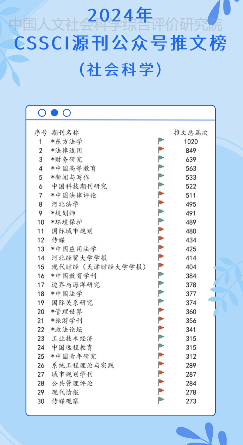 近日,中國(guó)人文社會(huì)科學(xué)綜合評(píng)價(jià)研究院發(fā)布《C刊公號(hào)年榜TOP 30》?!逗颖狈▽W(xué)》微信公眾號(hào)榮登2024年CSSCI源刊公眾號(hào)推文榜(社會(huì)科學(xué)),位列第8,推文總篇次為495篇。在前30家CSSCI源刊公眾號(hào)推文榜中,由2023年排名第23躍升至2024年排名第8。