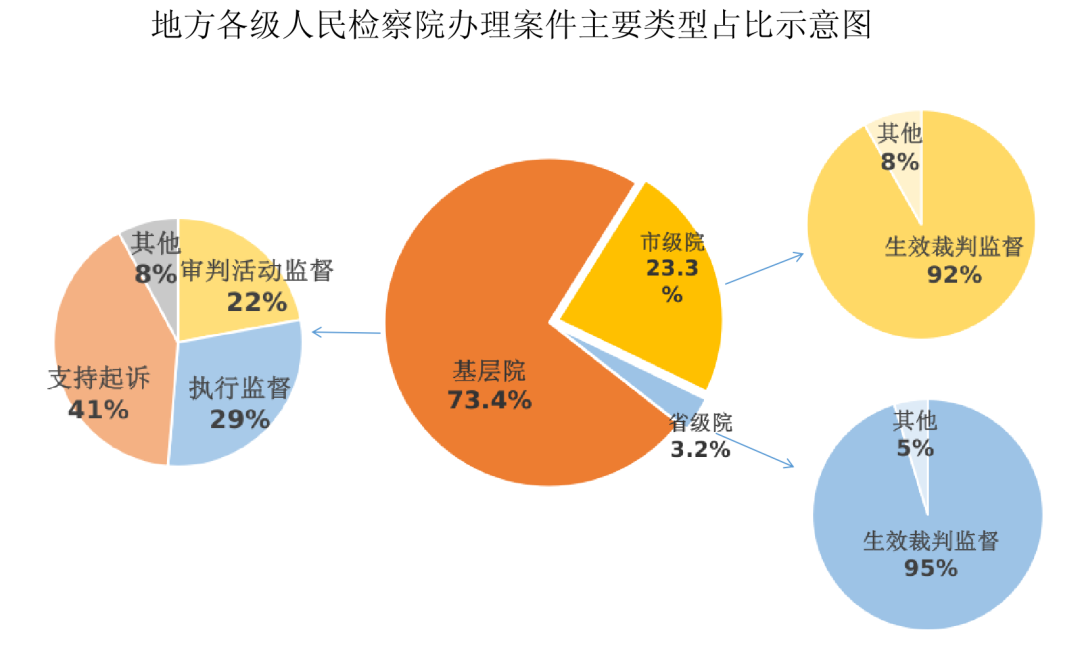 受理的275038件民事檢察案件中,基層院受理數(shù)占73.4%,市級(jí)院占23.3%,省級(jí)院占3.2%,最高檢243件。其中基層院以民事審判活動(dòng)監(jiān)督(44599件)、民事執(zhí)行活動(dòng)監(jiān)督(58975件)、支持起訴(82410件)案件為主,占本級(jí)辦理案件數(shù)的92.1%;市級(jí)院及省級(jí)院均以生效裁判監(jiān)督案件為主,分別辦理58832件、5320件,占本級(jí)辦理案件數(shù)的91.8%、95.3%。各級(jí)民事檢察部門形成各有側(cè)重、密切配合、一體履職的民事檢察監(jiān)督格局。