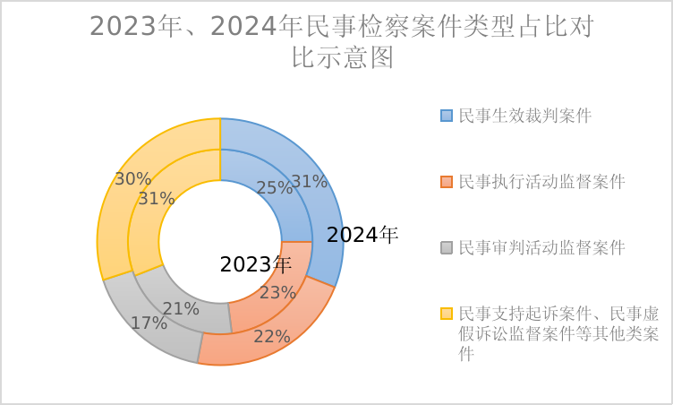 全年共受理各類民事檢察案件275038件[1],民事檢察監(jiān)督規(guī)??傮w保持平穩(wěn)。其中,生效裁判監(jiān)督83703件,審判活動(dòng)監(jiān)督47034件,執(zhí)行活動(dòng)監(jiān)督61464件,支持起訴案件82410件,占比分別為31:17:22:30(去年同期為25:21:23:31),生效裁判監(jiān)督案件占比增加,民事監(jiān)督更加聚焦主責(zé)主業(yè)。