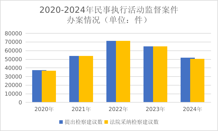 受理民事執(zhí)行活動(dòng)監(jiān)督案件61464件,2020年至2023年受理數(shù)分別為49390件、65842件、84125件、77310件,連續(xù)三年上升后2023年開始下降,2024年降幅較大(下降12.7%)。提出檢察建議51766件,法院采納率97.8%。