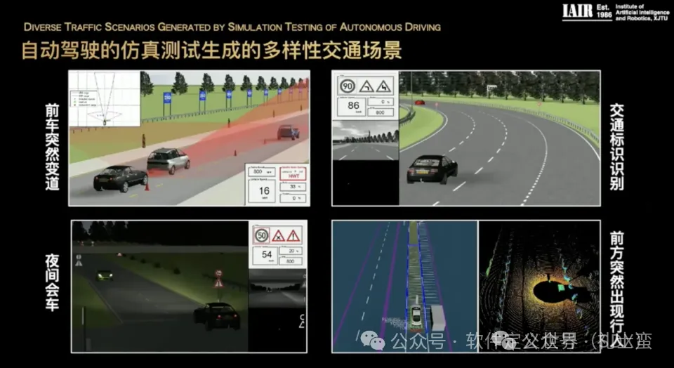 這里是自動駕駛仿真系統(tǒng)測試生成多樣性交通場景,如前車變道,對交通場景標(biāo)識識別,夜間會車,以及前方突然出現(xiàn)行人。我們團隊開展自動駕駛研究二十余年,走到今天我們?nèi)〉昧撕艽蟮倪M步,但實現(xiàn)完全自動駕駛依然是一個令人興奮而又望而生畏的艱難挑戰(zhàn)。