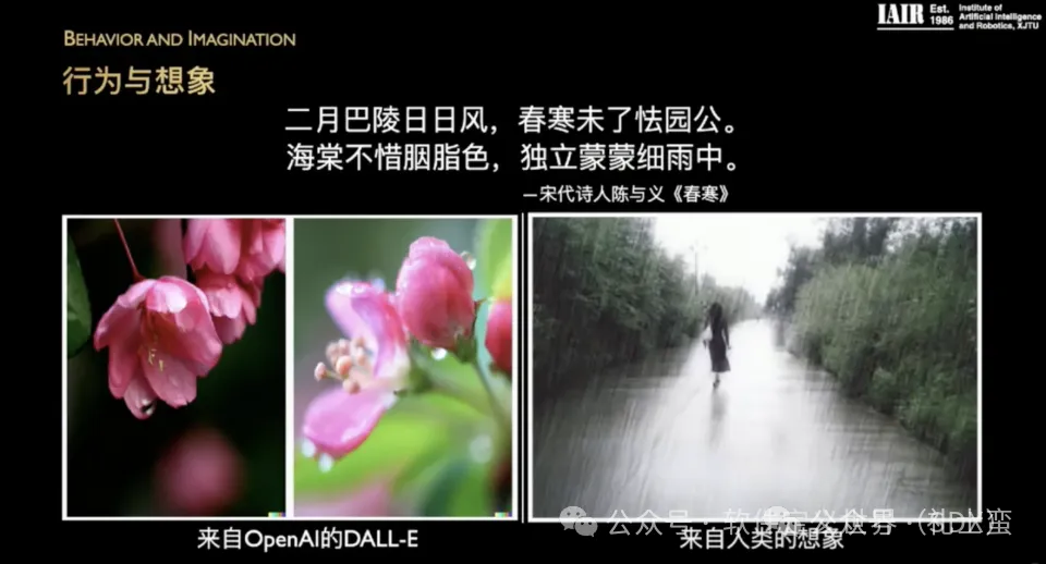 另外一個實例,給出一段西安絕句“海棠不惜胭脂色、獨立蒙蒙細(xì)雨中”。讓計算機語言理解的程序和人,分別從一個圖像數(shù)據(jù)庫中找出最貼切這段詩的圖像。計算機找出了這樣一幅圖,海棠上掛滿著雨滴,正真是“海棠不惜胭脂色、獨立蒙蒙細(xì)雨中”。