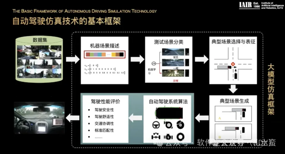 這里我們給出了一種基于大模型的自動駕駛仿真技術(shù)的基本框架,應(yīng)用機器學(xué)習(xí)可以生成多樣性交通場景來評價自動駕駛系統(tǒng)在不同交通場景下的駕駛性能,如安全性、舒適性、協(xié)調(diào)性,以及算法的可靠性,以及是否遵守相關(guān)法律法規(guī)。該基本框架由數(shù)據(jù)集包括注入的真實傳感器數(shù)據(jù)、機器場景描述、測試場景分類、典型場景選擇與表征、典型場景生成,包含一些副樣本等五大部分組成。