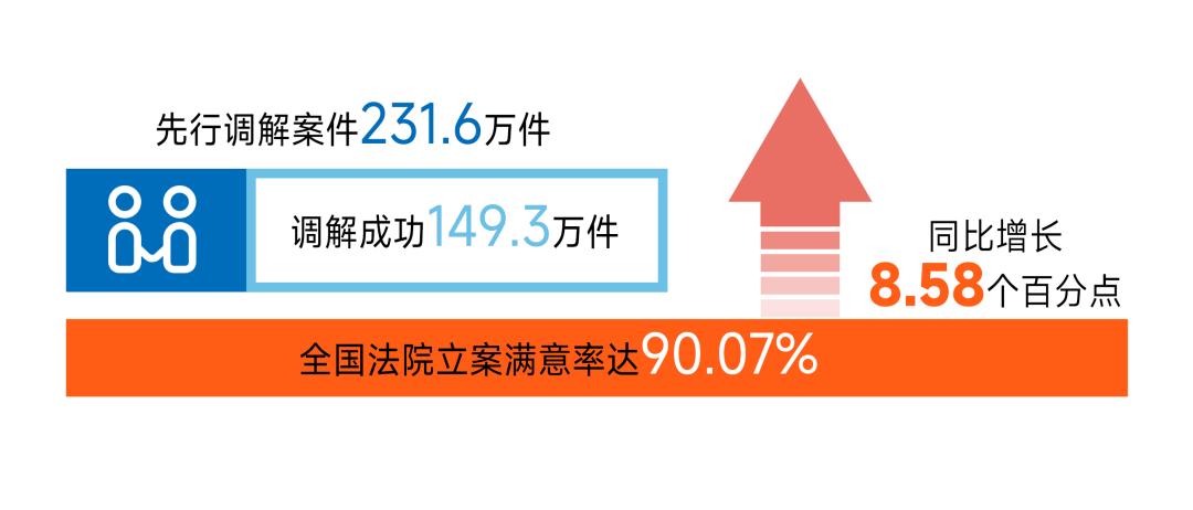 立案和先行調(diào)解情況。人民法院堅持把非訴訟糾紛解決機(jī)制挺在前面,全力參與社會治安綜合治理中心規(guī)范化建設(shè),有機(jī)銜接登記立案、委托調(diào)解、依法審理,持續(xù)深化完善訴調(diào)對接工作機(jī)制,有效發(fā)揮多元解紛機(jī)制作用。先行調(diào)解案件231.6萬件,調(diào)解成功149.3萬件,先行調(diào)解成功數(shù)量逐月明顯增長,第二季度先行調(diào)解成功107.2萬件,環(huán)比增長176.1%,前端解紛活力和效能持續(xù)釋放。截至6月底,2883家基層法院派出訴訟服務(wù)團(tuán)隊入駐綜治中心,促推糾紛化解從“多頭跑”向“一站解”轉(zhuǎn)變。指導(dǎo)“總對總”合作單位調(diào)解糾紛40萬件,其中依托人民法院調(diào)解平臺,“總對總”合作單位自行調(diào)解27.2萬件,同比增長10.3倍,“總對總”多元解紛機(jī)制持續(xù)深化。起訴狀、答辯狀示范文本應(yīng)用貫穿糾紛化解全流程,更有利于當(dāng)事人準(zhǔn)確、全面表達(dá)訴求,促推調(diào)解和案件審理質(zhì)效進(jìn)一步提升,72%的當(dāng)事人、律師主動應(yīng)用要素式示范文本開展訴訟,較第一季度增長21個百分點(diǎn),金融借款合同、信用卡、保證保險合同等糾紛起訴狀示范文本應(yīng)用率超80%,當(dāng)事人應(yīng)用體驗感持續(xù)提升,全國法院立案滿意率達(dá)90.07%,同比增長8.58個百分點(diǎn)。