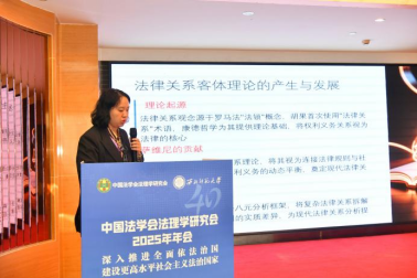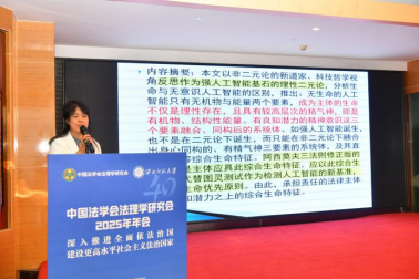 楊昌宇教授的報告以中國自主法學(xué)知識體系構(gòu)建為背景,認為該進程需以反思為前提,核心含兩大環(huán)節(jié):一是清點既有知識體系,厘清存量以定位知識進化梗阻點;二是將中國法治實踐新成就轉(zhuǎn)化為學(xué)理成果,她選取“法律體系概念重構(gòu)”為議題,通過梳理國內(nèi)研究發(fā)現(xiàn)其主要分為三個層面:建設(shè)完善層面聚焦實踐構(gòu)建,理論凝練層面?zhèn)戎貎?nèi)涵提煉,知識轉(zhuǎn)化層面需邏輯介入,屬知識論范疇。她指出,法律體系概念具有“一體兩面”屬性:既含實踐維度的法治制度體系,也包括理論維度的法學(xué)概念體系,二者不可割裂。當前重構(gòu)法律體系概念面臨三類癥候:一是理論與實踐存在張力,概念移植后遺癥、多元理論雜糅及實踐成果轉(zhuǎn)化遲滯并存;二是認識論混淆,法學(xué)概念與日常用語的法律體系常被混用;三是移植性思維主導(dǎo),缺乏本土資源挖掘與歷史維度考量。最后,她擔憂該概念難承研究重任,且參與數(shù)字法治交流后對新興范疇存惑,并初步提出三維革新路徑:本體論上挖掘本土資源,方法論上推動范式轉(zhuǎn)型,認識論上厘清概念雙維度邊界。